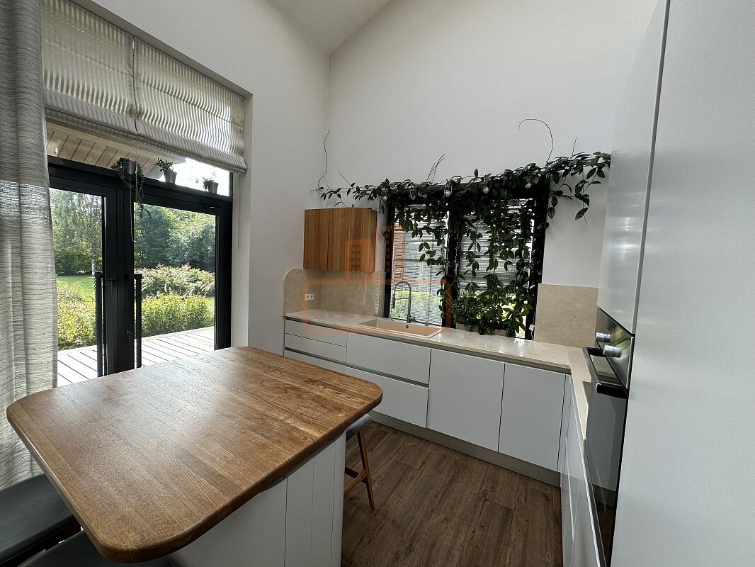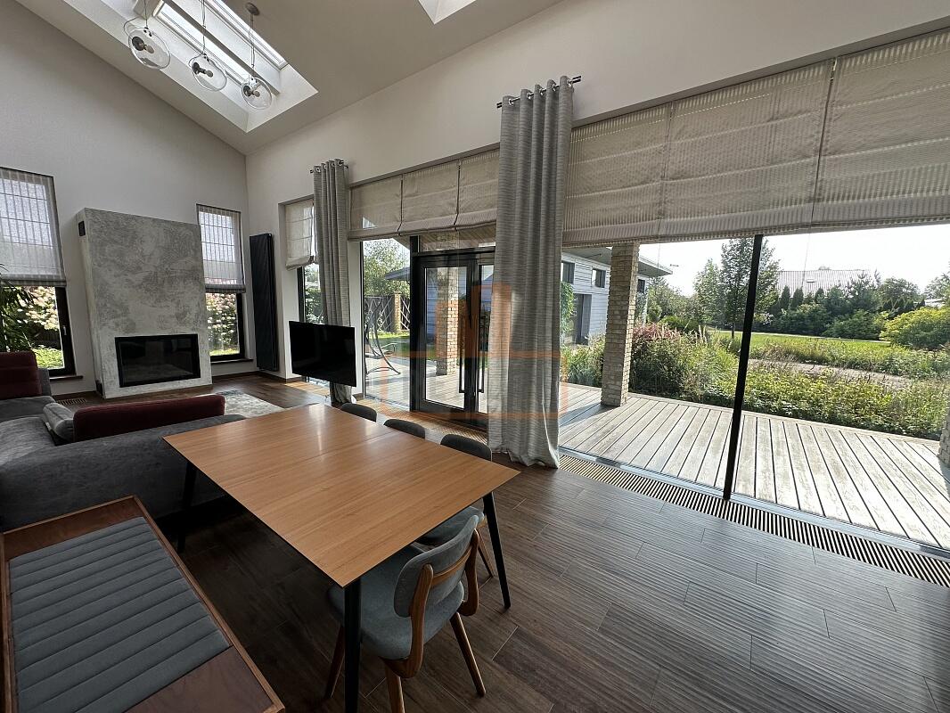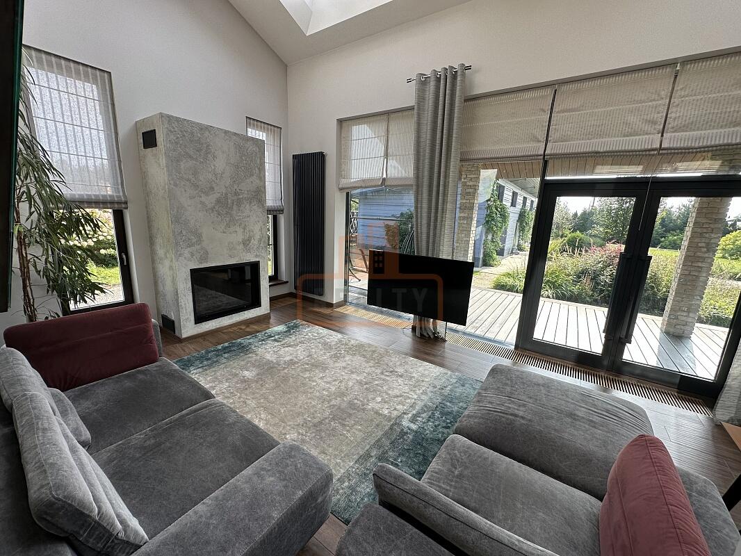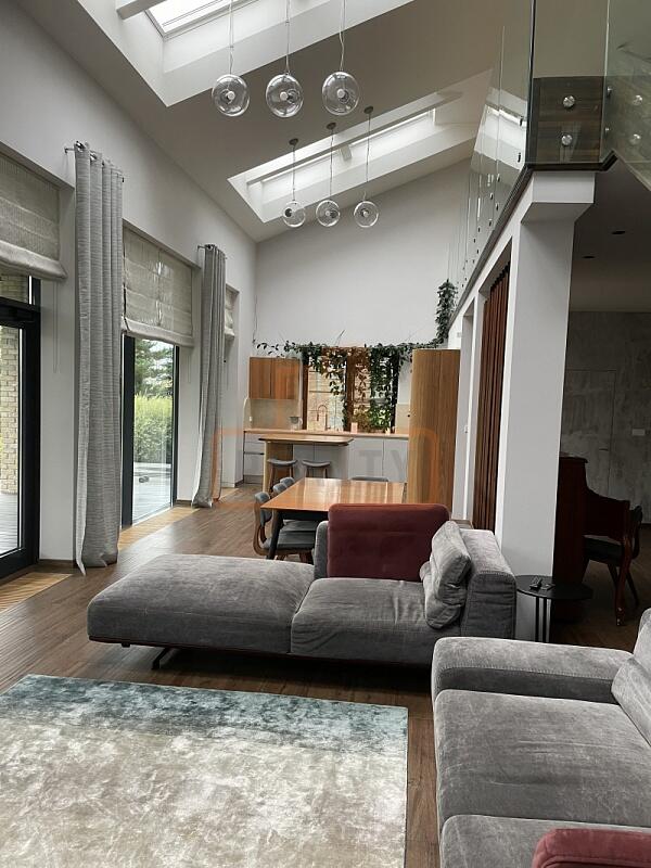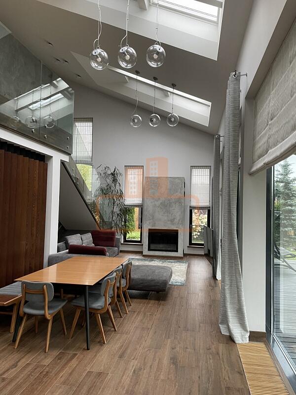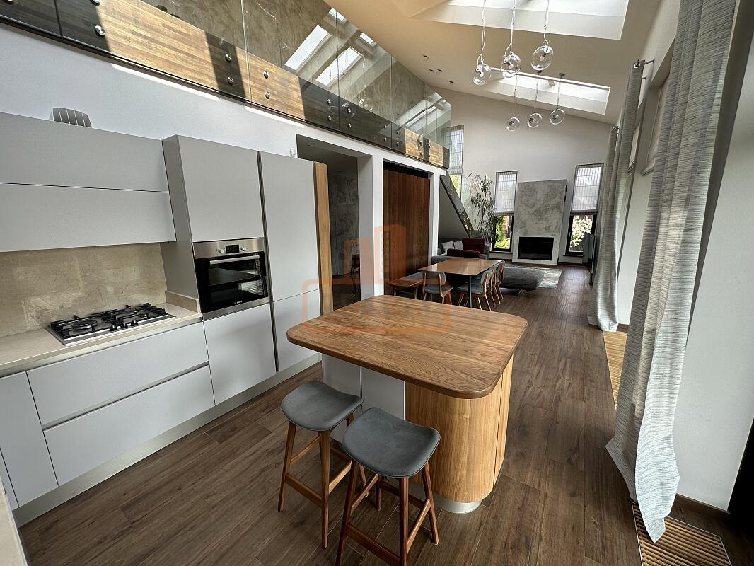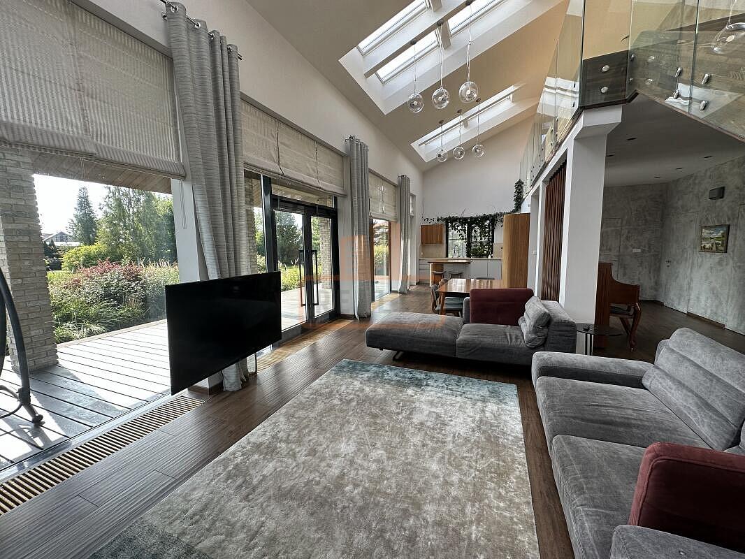 Сердце дома — это просторная кухня-гостиная с 6-метровым потолком, камином, панорамной стеклянной стеной открывающей вид на ухоженный сад. Специальная архитектура с 17 мансардными окнами VELUX (Дания, с электроприводами) наполняет пространство светом даже в пасмурные дни.