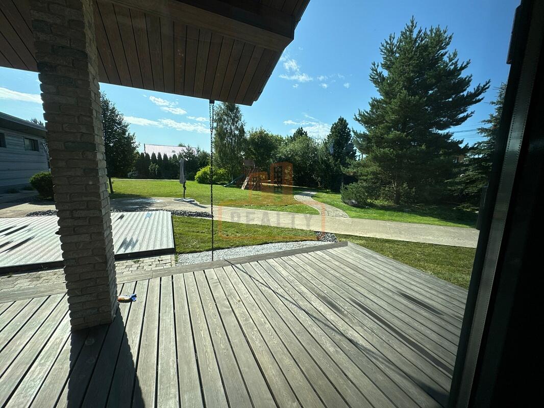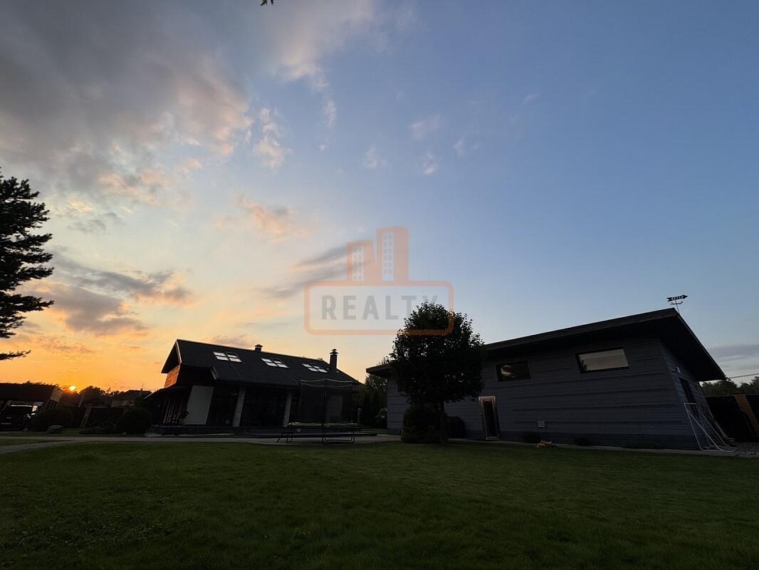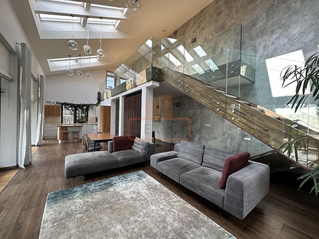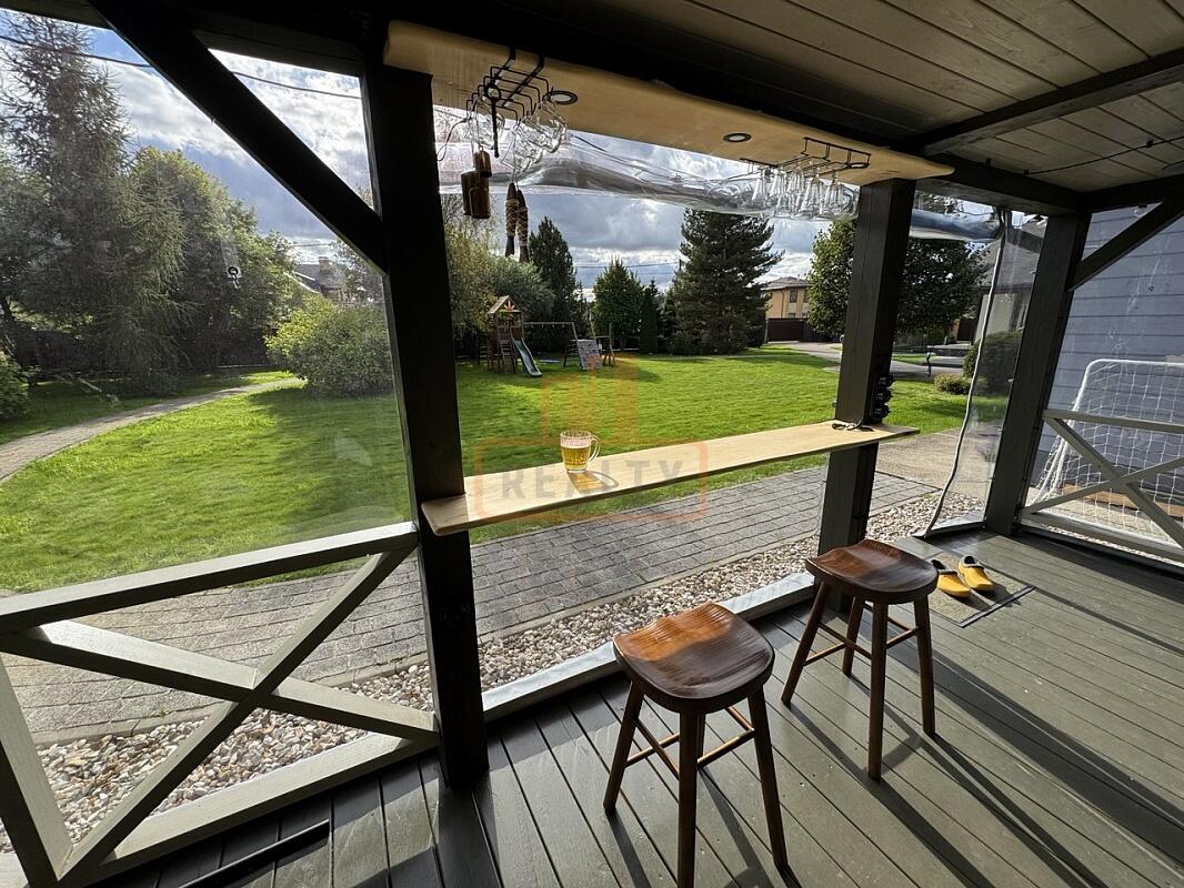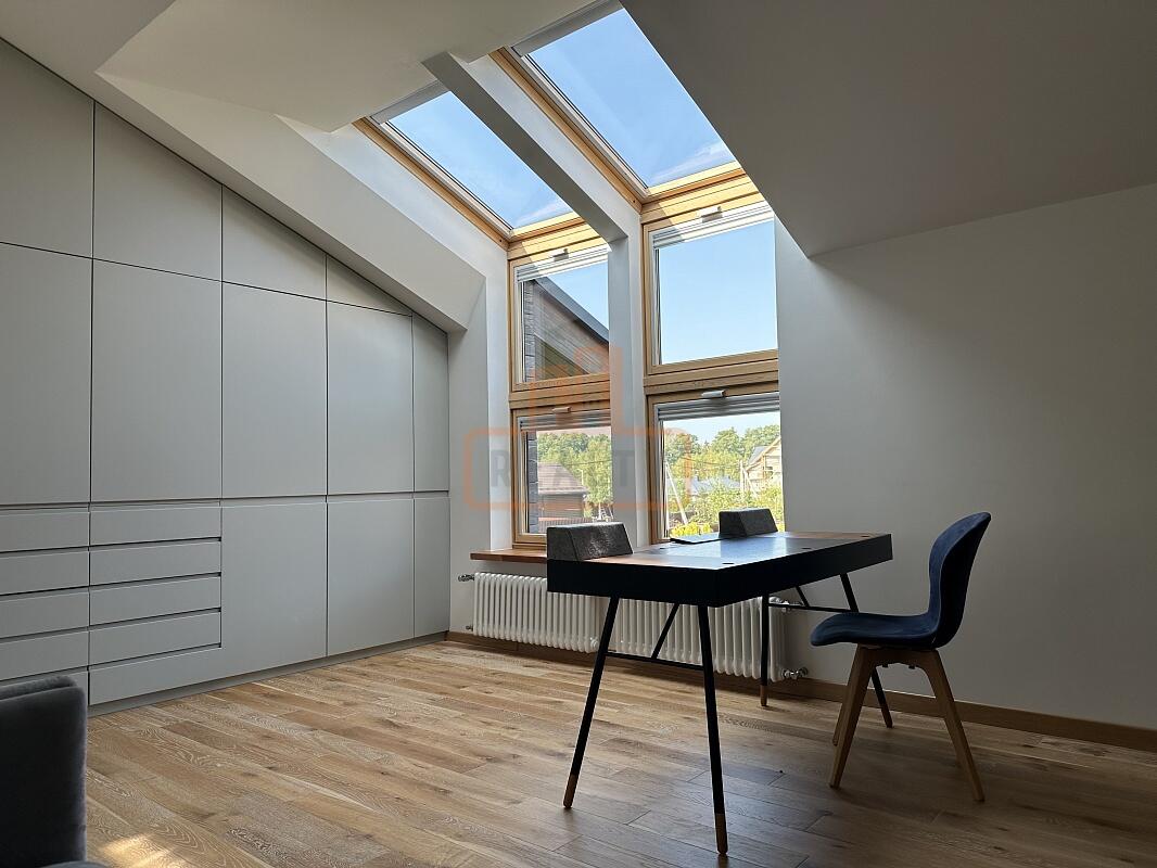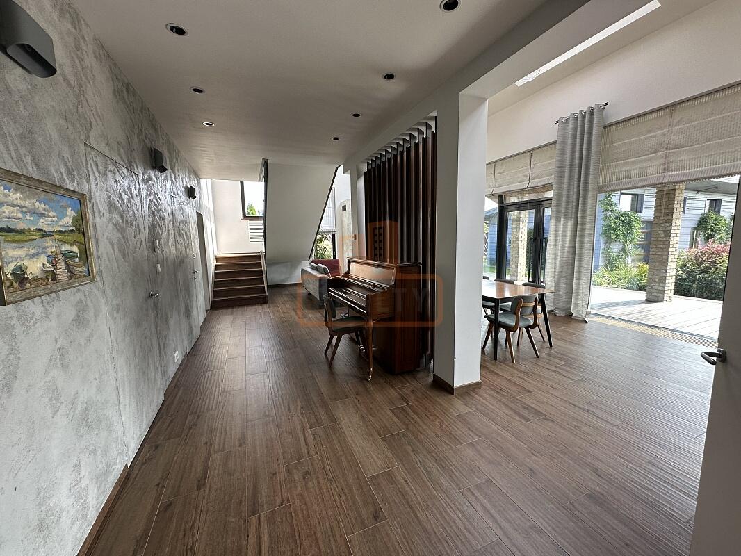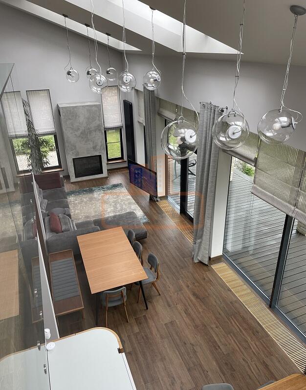 Сердце дома — это просторная кухня-гостиная с 6-метровым потолком, камином, панорамной стеклянной стеной открывающей вид на ухоженный сад. Специальная архитектура с 17 мансардными окнами VELUX (Дания, с электроприводами) наполняет пространство светом даже в пасмурные дни.