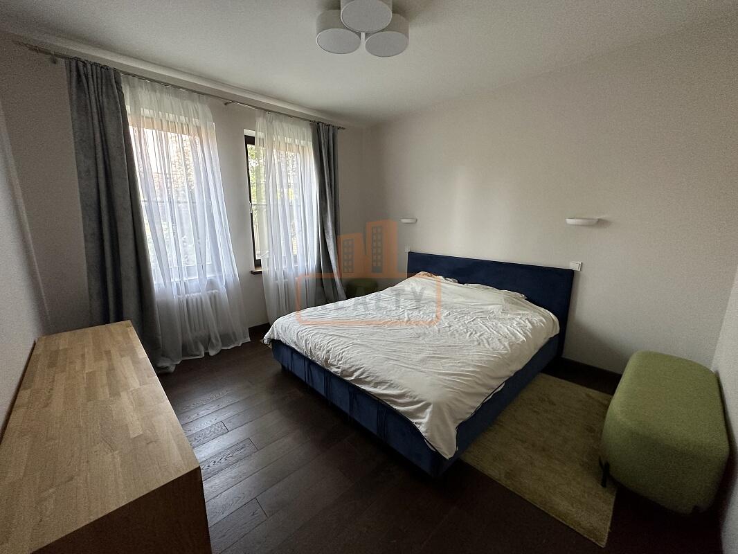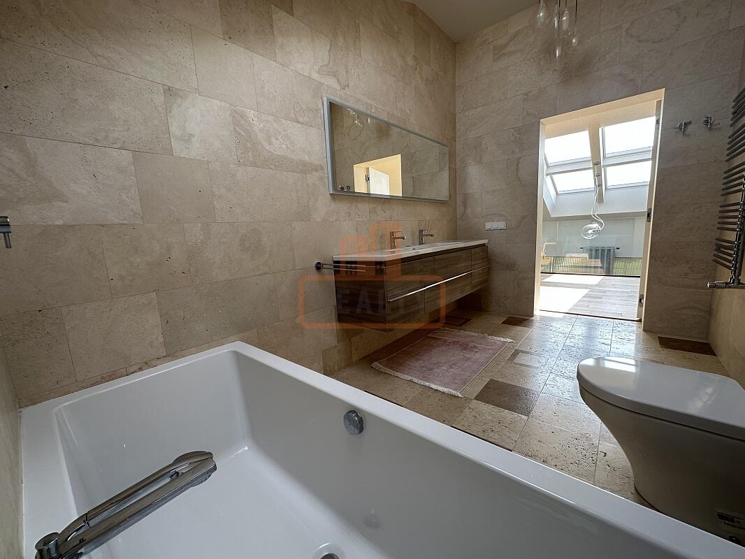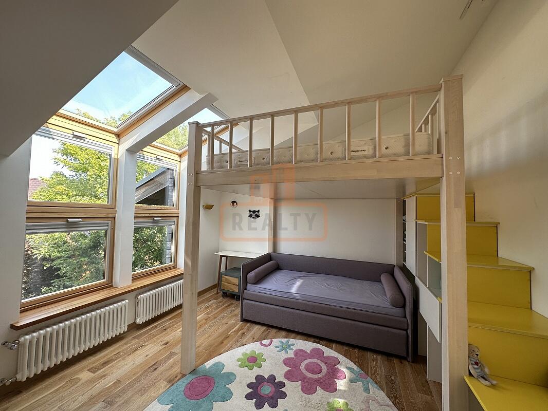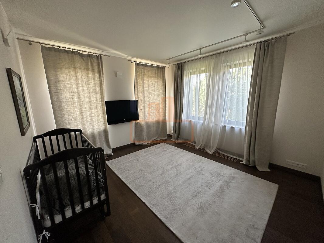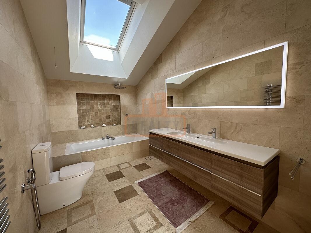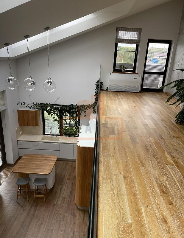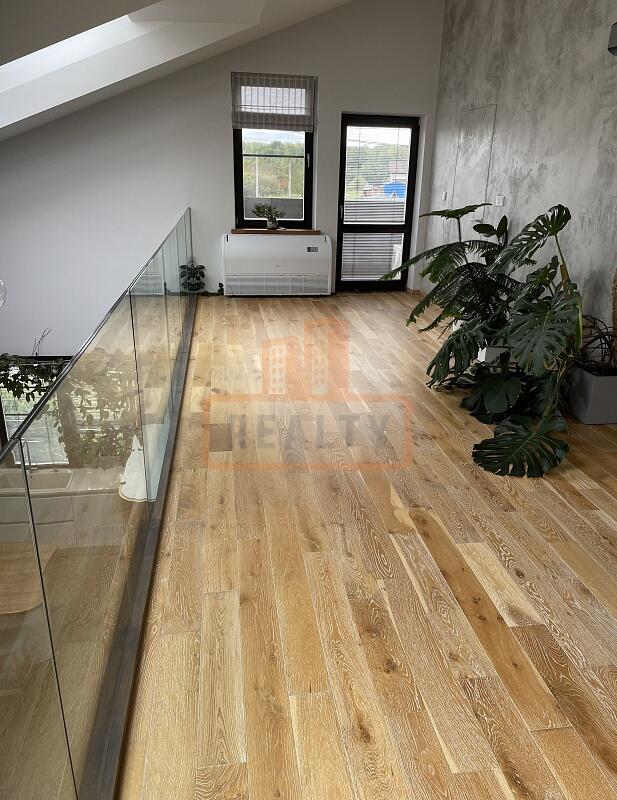 Сердце дома — это просторная кухня-гостиная с 6-метровым потолком, камином, панорамной стеклянной стеной открывающей вид на ухоженный сад. Специальная архитектура с 17 мансардными окнами VELUX (Дания, с электроприводами) наполняет пространство светом даже в пасмурные дни.