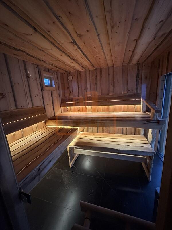 Эксклюзивный проект из полярной сосны «Кело». Внутри: парная, комната отдыха с барной стойкой и лофт-освещением, водяной теплый пол. Примыкает утепленная терраса 32 м? с панорамным остеклением «мягкими окнами».